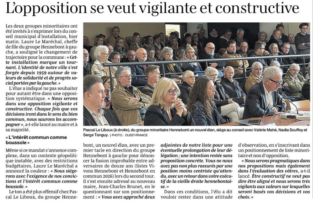 Article du Ouest-France https://www.ouest-france.fr/bretagne/hennebont-56700/a-hennebont-lopposition-se-veut-vigilante-et-constructive-e87a92b0-2b86-11f1-9163-025005abf8da Article du télégramme https://www.letelegramme.fr/morbihan/hennebont-56700/a-hennebont-un-mandat-qui-sannonce-complexe-7015076.php